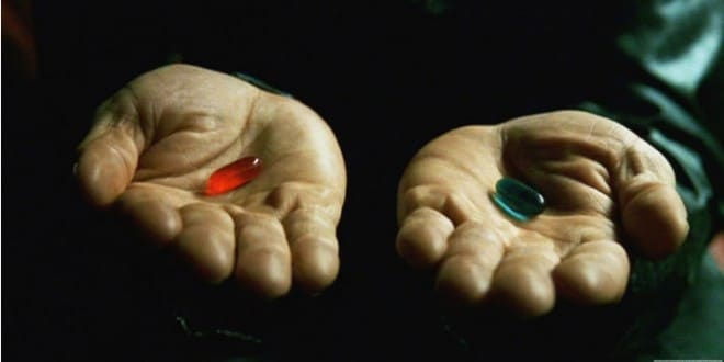 La consapevolezza, brutta storia, strega ammalitrice al contrario. Ma Matrix e The Truman Show ci indicano una via possibile. Noi non siamo eroi da pellicola, ci accontentiamo di scegliere la pillola rossa per una volta, se poi ci prenderemo gusto ci rivolgeremo allo spacciatore di pillole rosse.