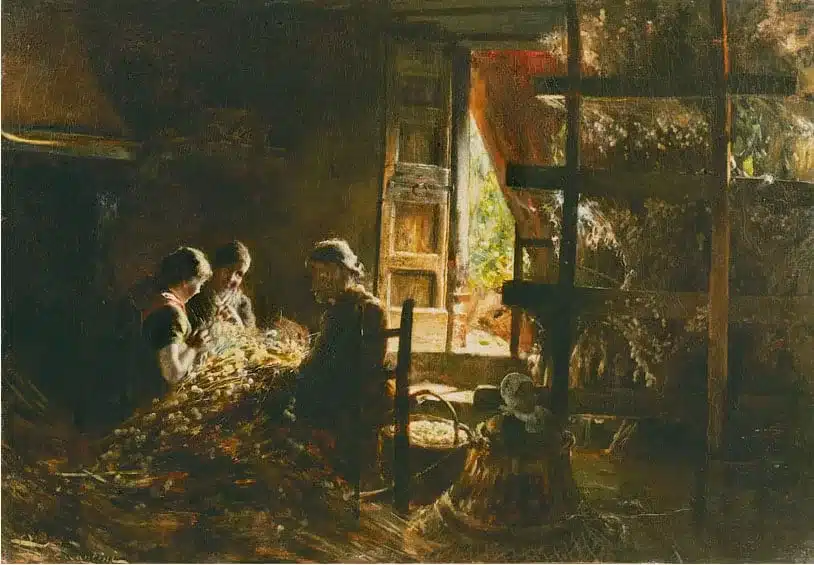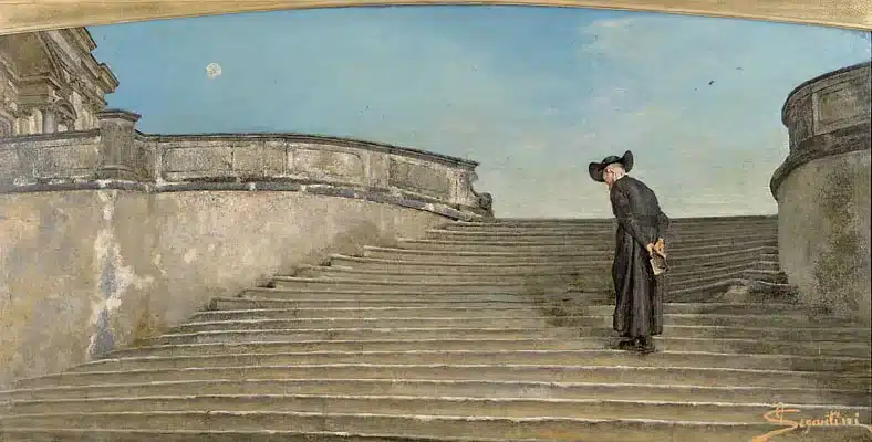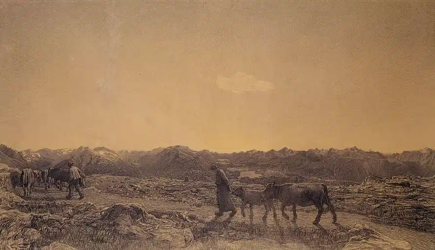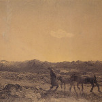 Cito solo altre due opere, non perché siano le sole ad essermi rimaste impresse, ma per non dilungarmi troppo. L’ultima fatica del giorno ritrae un pastore a fine giornata lavorativa, mentre riporta indietro il gregge e un grosso fascio sulle spalle. Tutta la fatica dello sforzo, ma anche della quotidianità lavorativa, ma anche di una vita impegnata in umili armeggi: un’intensità straripante, un attimo di vita colto e una vita intera narrata.