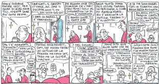 I recenti attacchi terroristici parigini hanno sollevato interrogazioni anche in merito all’opportunità di organizzare il prossimo Giubileo. Ecco come interpreta il vignettista romano i diversi punti di vista degli attori in causa, in questo caso Papa Francesco, i vescovi e una guardia svizzera di Torvaianica….