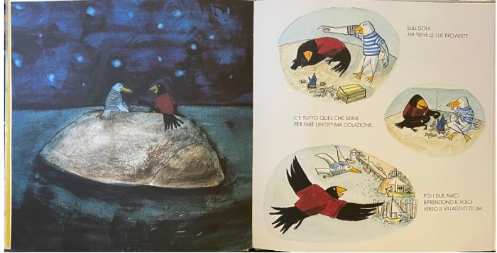 Anche in questa storia, così come in altre della Crowther, vi è un gioco di contrasti che dialogano in maniera armoniosa e inviano al lettore un messaggio ben preciso. Salta subito all’occhio la differenza cromatica dei due personaggi, il gabbiano bianco e il merlo nero, e veniamo anche a conoscenza della loro differenza caratteriale, la tenacia di uno e la fragilità dell’altro, dovuta soprattutto ai comportamenti ostili che gli altri gabbiani che abitano il villaggio mostrano nei confronti del povero merlo.