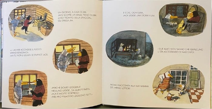 Col suo stile inconfondibile, l’autrice belga ci racconta la storia di Jim, un gabbiano, e Jack, un merlo, del loro incontro del tutto casuale e della loro amicizia nata con naturalezza ma talmente salda da saper fronteggiare i contrasti e le diffidenze che incontrano sul loro cammino