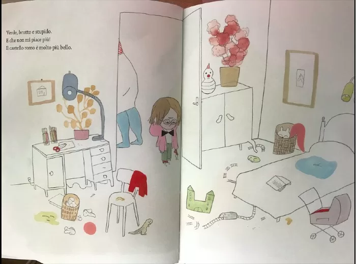 Come ha potuto commettere un errore di valutazione così grande? Come farà a separarsene? Il ragazzino allora chiede aiuto alla mamma: non sarà forse possibile sostituire il regalo incartato, il famigerato castello rosso, con il castello già in suo possesso – identico – ma verde? D’altronde ragazzi il rosso è il colore di Valentino, il colore della passione, del rossetto di Chanel, etc. etc. Non possedere il castello rosso è una questione di vita o di morte.