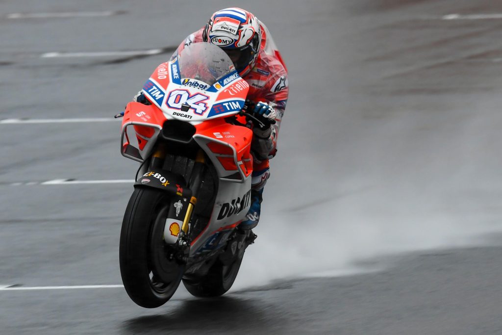 MotoGP, risultato fp2 Motegi 2017 – Andrea Dovizioso è il più veloce sotto la pioggia giapponese, il forlivese si prende la vetta nella seconda sessione sopravanzando Marquez di soli 43 millesimi. Gran bel terzo tempo per l’Aprilia di Aleix Espargaro, seguito da Lorenzo, in palla nonostante l’acqua. Dodicesimo Valentino Rossi
