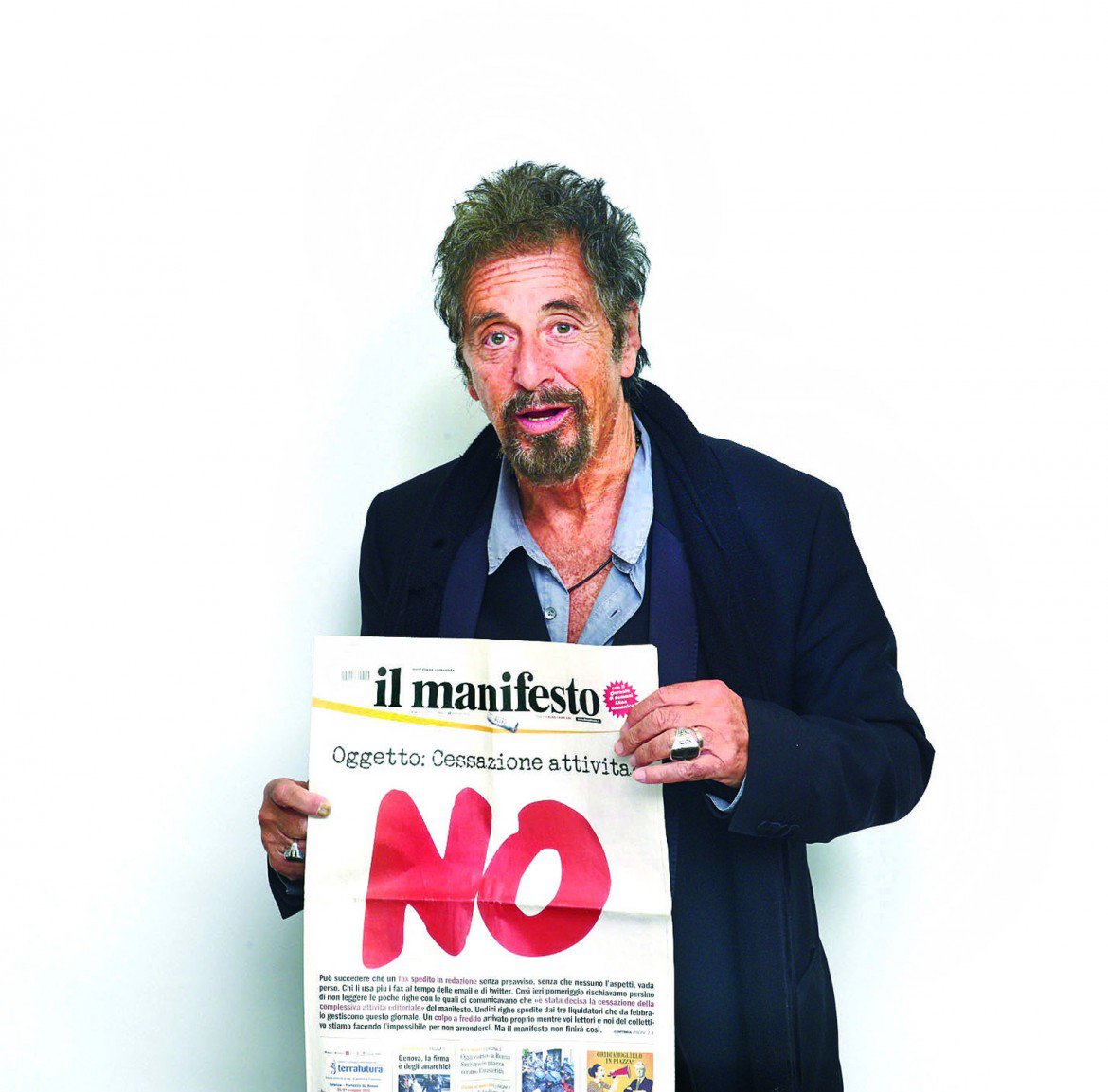 Che i rimborsi all’editoria in passato siano stati dei pozzi senza fondo dove personaggi più o meno loschi hanno attinto per scopi personali è un dato di fatto. Come è un dato di fatto, però, che il finanziamento pubblico dei quotidiani e dei periodici è fondamentale, soprattutto in questo periodo, per garantire un minimo di libertà di pensiero. Il Manifesto come del resto molte altre redazioni, con quei finanziamenti “ci campano” sul serio, e la scelta di Renzi di eliminare, per di più retroattivamente, i rimborsi 2013 rischia di mandare gambe all’aria molte testate. Il giornale fondato, tra gli altri, da Rossana Rossanda, da parte sua lotterà come può, sia sensibilizzando il pubblico con campagne d’impatto, sia dando vita a iniziative speciali. Per quanto riguarda “l’impatto”, la faccia ce l’ha messa il mitico Al Pacino, fotografato da Luca Celeda con in mano una copia del giornale, riguardo le iniziative invece, vi ricordiamo il numero speciale del 18 dicembre. Sarà a colori, avrà una maggiore foliazione e parlerà dell’anno che verrà. Il numero costerà 20 euro, soldi con cui regalerete un futuro ai dipendenti del Manifesto e a voi stessi l’illusione di aver preservato ancora per un po’ il concetto fuggevole di pluralità dell’informazione.