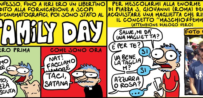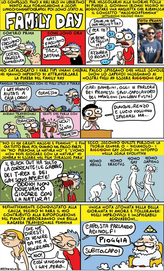 Si è dichiarata la necessità di difendere la famiglia composta da uomo e donna dall’attacco sempre più incessante di gay e progressisti che, al grido di “Abbiamo gli stessi vostri diritti”, vorrebbero imporre un modello di famiglia differente. Si è manifestato anche sulla fantomatica Teoria Gender che nella realtà non esiste (ne parliamo anche QUI), ma nella testa di questi timorati, invece, è una subdola tecnica con cui nelle scuole si stanno formando eserciti di futuri omosessuali con barba e gonnellino. Mi fermo qui perché la cosa fa abbastanza ridere e io, che non sempre spicco per inventiva, rischierei di bollare il tutto alla voce CAZZATA.