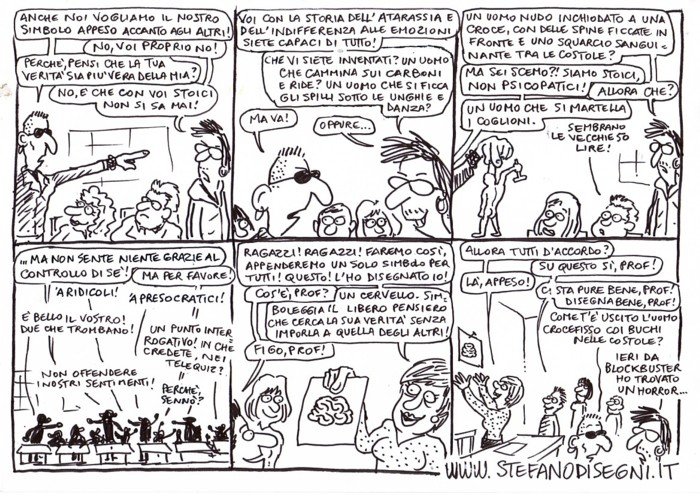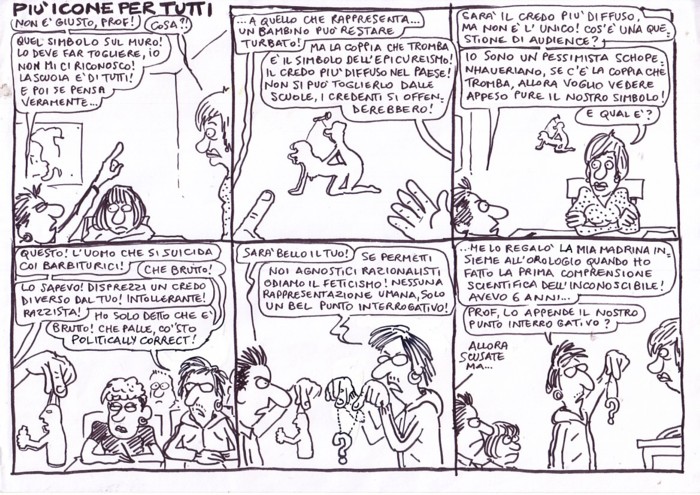Più che un clic d’autore, questa è una vignetta d’autore che, visto il momento, ci sembra doveroso divulgare: davanti a una selva di simboli “escludenti”, l’unica vera salvezza è il libero pensiero.