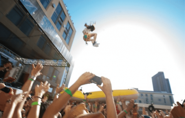 Guardate questa foto. Il tizio che si butta a bomba mirando un canotto è un DJ di fama Mondiale, tale Steve Aoki, celebre non solo per deliziare con i suoi djset ogni volta migliaia e migliaia di persone, ma anche per avere l’usanza, durante le sue esibizioni, di lanciarsi dal palco e fare crowd surfing (cioè farsi trasportare dalle braccia dei fan).