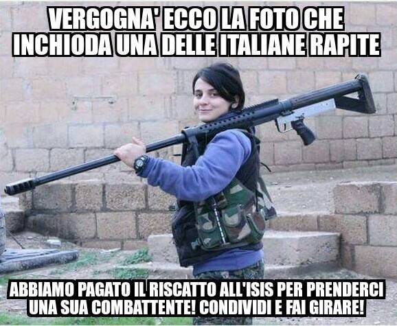 … si è scatenata una fenomenale tempesta mediatica che col tempo ha, complice la rete, assunto proporzioni mostruose. Si è passati dal “non dovevano partire, stupidine” al più incisivo “no cioè, fatemi capì, noi paghiamo il riscatto per due zoccole che si fanno trombare dai terroristi?“. Posto che nessun riscatto è stato pagato e che, personalmente, ritengo ignobile la bile che si è riversata su due semplici ragazzine, oltretutto tra le poche rimaste a credere in qualche cosa (sbagliata o giusta che sia), quest’oggi sono rimasto parecchio colpito da una polemica innescata da un post su facebook dello scrittore Nicolai Lilin. In pratica, il buon Nicolai ha postato sulla sua pagina un evidentissimo fake con annesso slogan inquisitore, in cui viene ritratta una soldatessa che imbraccia un gran bel fucilone e spacciata per la Marzullo (la foto completa è qui in basso, mi faceva un po’ schifo metterla in copertina). Lilin, a corredo dello scatto chiede ai suoi likers (ben 90.000) di fornirgli informazioni in merito, perché a suo dire non è molto ferrato sulla faccenda. Ovviamente, complice l’enorme seguito dello scrittore su facebook, il post ha scatenato i peggio istinti dell’utente medio e, di risposta, le seguenti critiche di una buona parte dell’informazione. Francamente non so cosa pensare, conosco poco Nicolai Lilin, anche se il suo Educazione Siberiana mi è piaciuto un sacco. Le poche volte che l’ho sentito parlare non ha mai detto cazzate sesquipedali (anzi, al contrario) e, soprattutto, ho sempre considerato la sua schiettezza transnistriana un valore positivo. Per questo motivo, quel post, non mi dà l’idea di essere l’errore – come si è giustificato lui – di uno che non conosce i fatti, ma piuttosto la scelta ponderata (e anche un po’ stronza) di uno che la sa lunga in fatto di social marketing (quanto tirano le cazzate su facebook…). Che dire, ognuno è libero di farsi la propria idea. In ogni caso, quello che rimane è che a distanza di giorni dalla liberazione, ma soprattutto dopo gli insulti web piovuti da tutta Italia e culminati con le carinerie twitter del sempre fine e centrato Maurizio Gasparri, quel post ha contribuito a riversare l’ennesima palata di merda su di una ragazza di soli 16 anni. Francamente non se ne sentiva il bisogno.