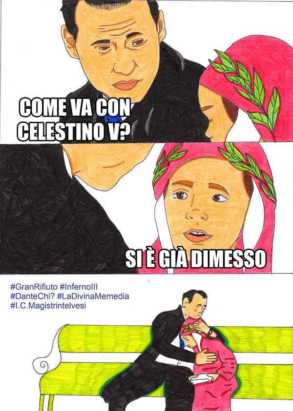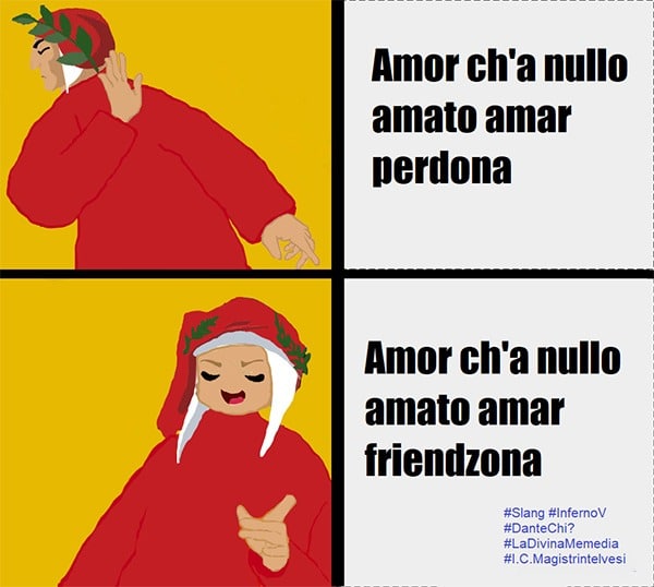 Tra le rubriche più divertenti c’è sicuramente la Divina Memeria, dove gli studenti hanno  selezionato alcuni dei meme più popolari del web reinterpretandoli in chiave dantesca, sia avvalendosi di supporti digitali che classicamente cartacei. Troviamo quindi il celebre “Amor, ch’a nullo amato amar perdona” alle prese con la terribile categoria moderna della friendzone. Area questa molto bazzicata (parrebbe ad occhio) dal Sommo Poeta vista la sua visione “platonica” dell’amore.