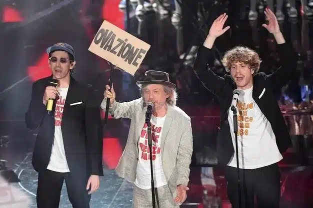 I ragazzi de Lo Stato Sociale conoscono bene la faccenda e se la gestiscono benissimo, sono preparati, Francesco Draicchio è un ricercatore universitario ad esempio. I cinque hanno imparato a guidare una macchina mediatica che spesso divora ma che forse in questo caso è spogliata dall’intelligenza tattica della band. Vedere il nome di Radio Fujico a Sanremo, vedere i nomi dei lavoratori licenziati sulle giacche, rivedere Paolo Rossi è stato un piacere notevole per gli occhi di chi quel mondo lo ha conosciuto e amato.