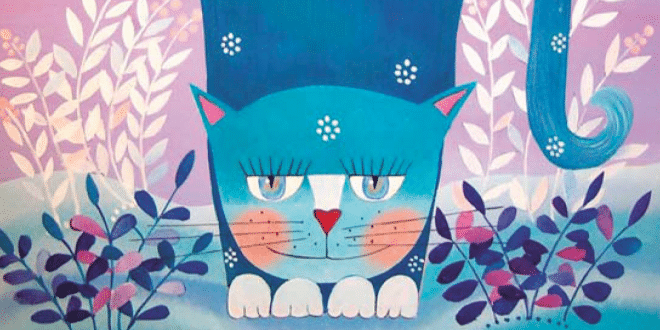 Amici fino in fondo è un libro che cattura l’attenzione. Innanzi tutto per l’illustrazione in copertina: una gatta gigante blu a fiori, un prato, una luna calante, delle stelle in un cielo rosa-violaceo. Si fa notte. E la gatta sorride.