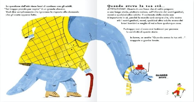 Giro pagina dopo giro pagina entrano in scena alcune delle risposte e delle domande più comuni che gli adulti dicono ai bambini (con annessa la chiave di lettura) che D. Calì ha raccolto dopo averli ascoltati per diverso tempo. I pennarelli di N. Vola insistono sapientemente sull’ambiguità di certe espressioni e tracciano un mondo caricaturale, ma quanto mai calzante.