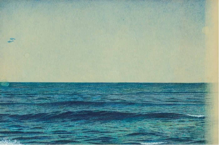 L’uso di questa tinta ci dice in qualche modo che M. rivede se stesso nel mare e nelle sue svariate forme – a volte calmo, altre increspato e altre volte ancora in tempesta – e in questo modo impara a prendere coscienza delle emozioni che crescono con lui. Queste sensazioni contrastanti emergono in tutto l’albo illustrato in quanto nelle doppie pagine l’apparato iconico si basa sull’uso dei toni freddi del blu, portatori di calma e rilassatezza, ma anche di  tristezza e malinconia.