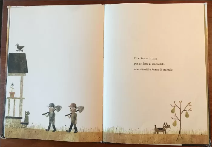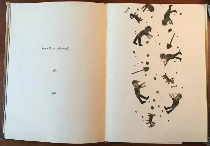 A un certo punto, dopo essere diventati completamente marroni, dopo aver bevuto tutto il latte al cioccolato e mangiato tutti i biscotti a forma di animale, stremati, i bambini si addormentano. Ma il cane, attento, continua a scavare tanto da far cadere tutti e tre «giù, giù, giù, finché non atterrano sul morbido»[3].