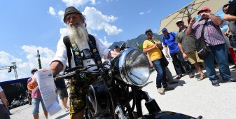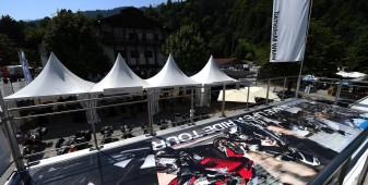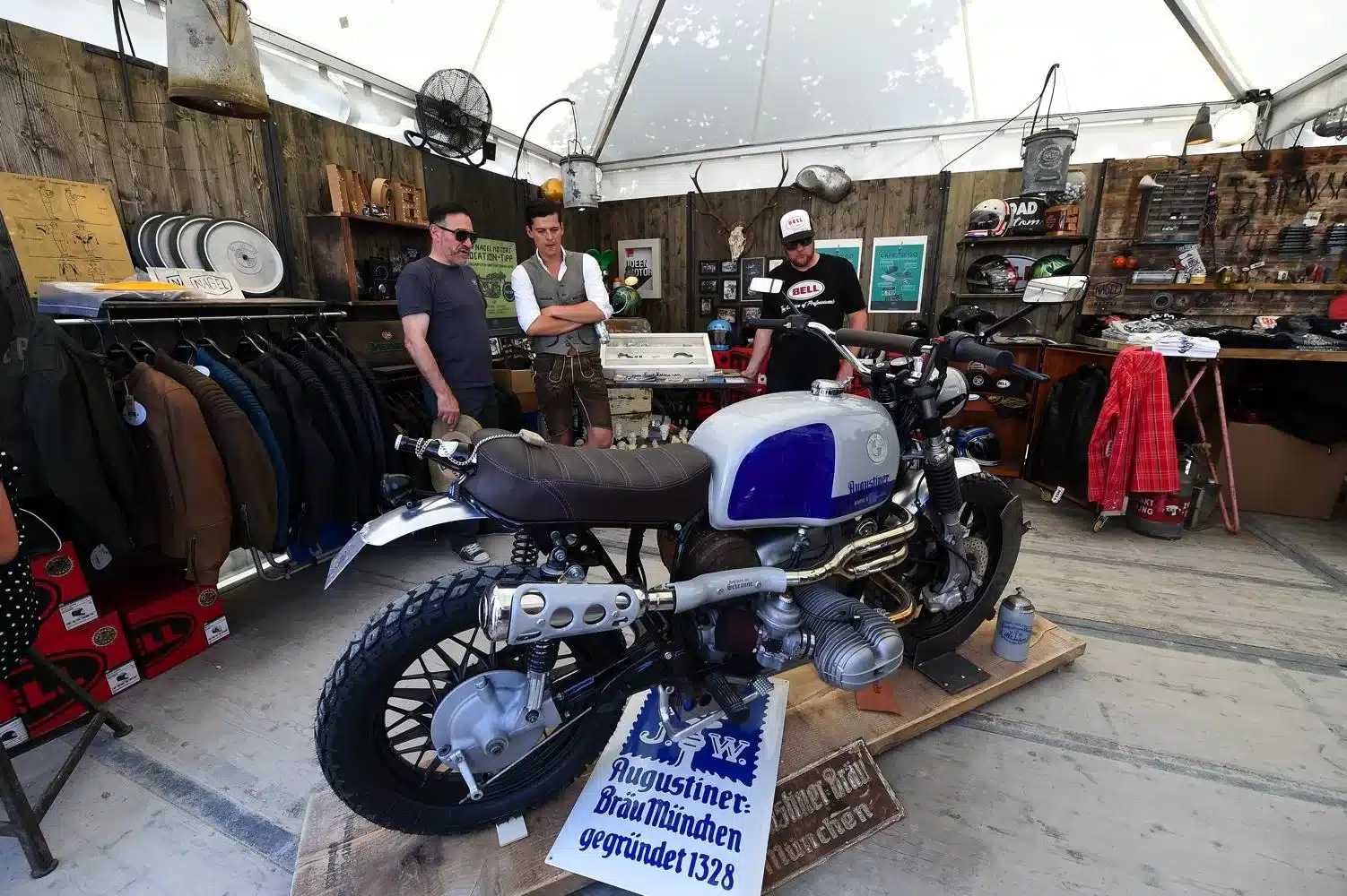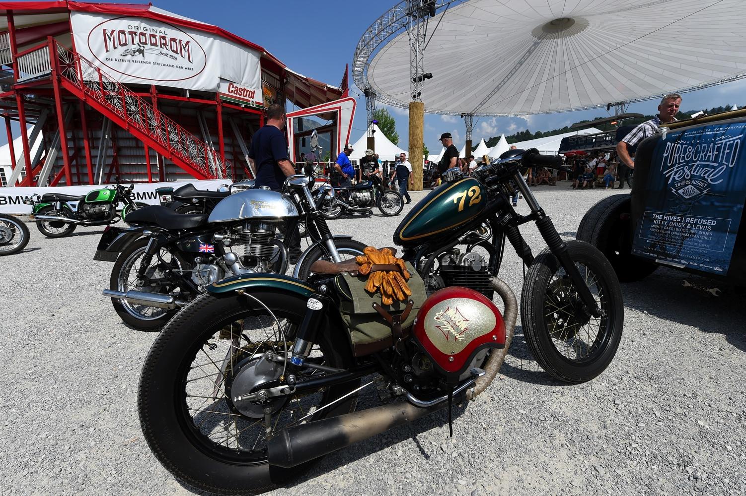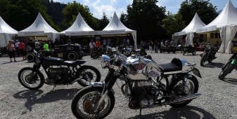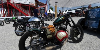 La passione, leitmotiv di questi tre giorni, si è respirata un po’ ovunque: tra gli stand di accessoristica (Touratech e Wunderlich su tutti) con cataloghi grossi come Pagine Gialle e capaci di ribaltarti minuziosamente ogni singolo bullone della tua moto. La passione si è vista negli spettacoli stunt di Chris Pfeiffer o nei pazzi che giravano in perpendicolare sul muro della morte. La passione si percepiva tra la gente che affollava gli stand dei preparatori, tra cui gli italiani Moto su Misura e le Officine Sbrannetti, questi ultimi, a mio parere, meravigliosi interpreti della R nineT con la loro Spirit of Zeller. La passione soprattutto, la si è respirata nelle chiacchiere della gente, nei loro occhi avidi di novità e nella voglia di confrontarsi, condividere un amore e raccontarsi le proprie esperienze. Luogo principe di tutto questo contatto è stato senza dubbio il tendone, che io, alla terza pinta da un litro, ho soprannominato l’inferno sceso in terra. Del resto, come si può definire un luogo con migliaia di persone stipate sotto una soffocante copertura di plastica, che bevono ininterrottamente birra e mangiano stinco durante il weekend più caldo che Garmisch ricordi dai tempi del regno prussiano?