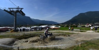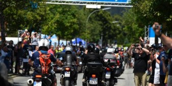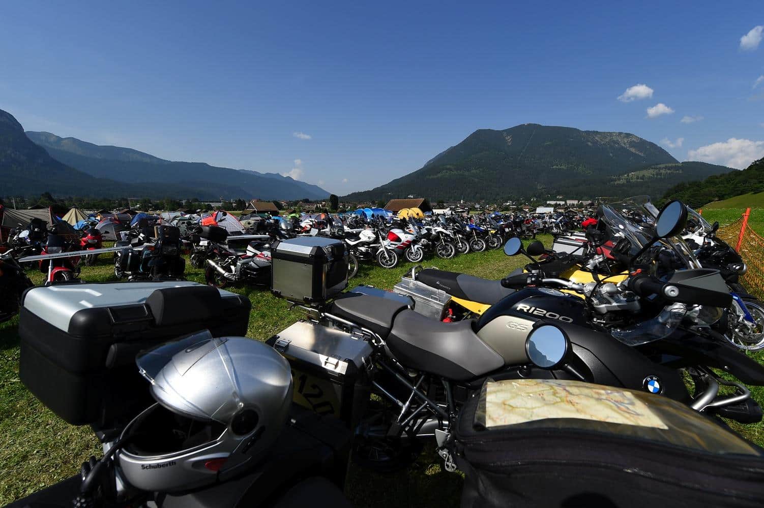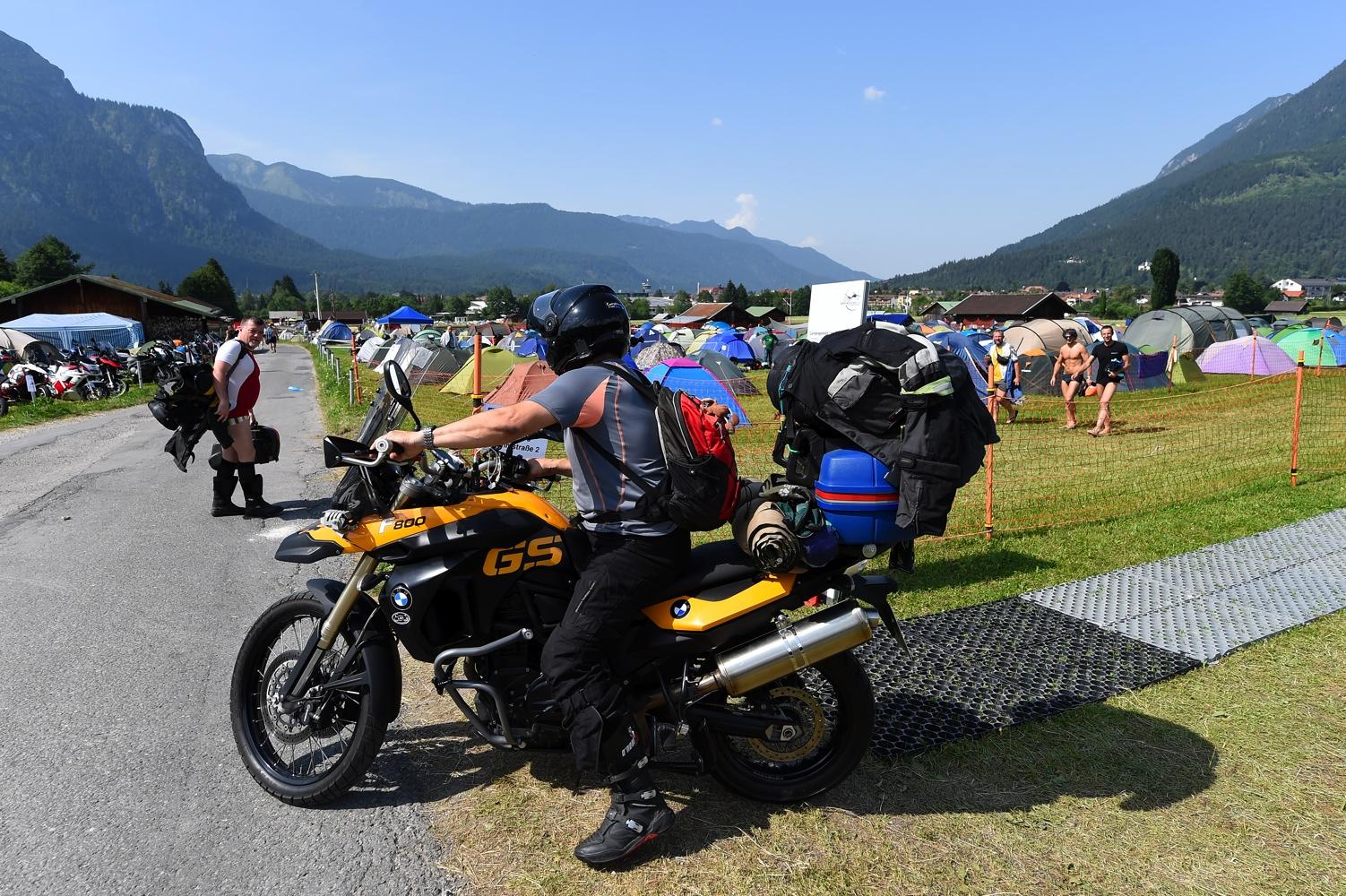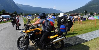 Una volta sistemati nelle stanze ci siamo messi comodi e con le moto abbiamo raggiunto la sede del raduno, e qui la prima sorpresa. Lo dico subito, mea culpa: i BMWvuisti non c’entrano nulla coi milanesi, ma sono dei motociclisti veri. Lasciate perdere le fighette mie concittadine (ok, non generalizzo, diciamole fighette che conosco io): il BMWuista medio è uno che viaggia e che la moto se la cuce addosso. Lo si percepisce osservando lo stato delle moto bavaresi parcheggiate in ogni dove, oggetti ben lontani dall’essere l’ultimo modello, moto vissute, moto che hanno viaggiato e che hanno messo le loro ruote un po’ dappertutto. Ho visto targhe arrivare da ogni dove, compresa la Russia e ho visto motociclisti di ogni tipo: dal panzone viaggiatore che gira in mutande per gli stand, al tipico tedesco in pantalone tecnico di pelle anche con 40 gradi (già, a Garmisch, il weekend dell’evento c’era un caldo che si abbaiava) fino alla motociclista dal capello sbarazzino tinto di viola, arrivata dalla Repubblica Ceca, orgogliosamente sola e orgogliosamente in sella alla sua F 800. Ai BMW Days, insomma, ho visto, tra le altre cose, una vera appartenenza al marchio e una vera passione per la moto in generale.