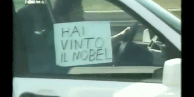 Era il 1997, viaggiava in auto con l’attrice Ambra Angiolini, con la quale stava girando una puntata del format on the road “Milano-Roma”, quando una macchina li sorpassa e mostra il messaggio. “Non ne parlavo per scaramanzia“, affermò il Maestro emozionato, “Incredibile, è da vent’anni che sono in lizza per il Nobel, non immaginavo assolutamente“.
