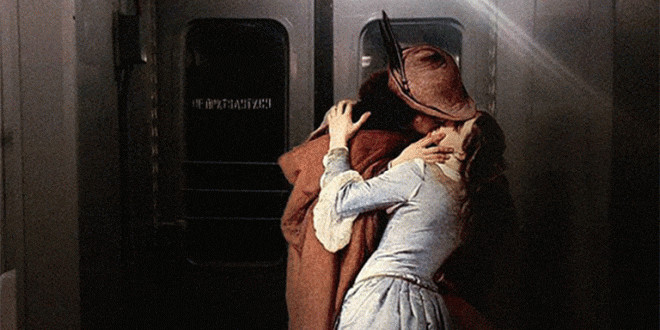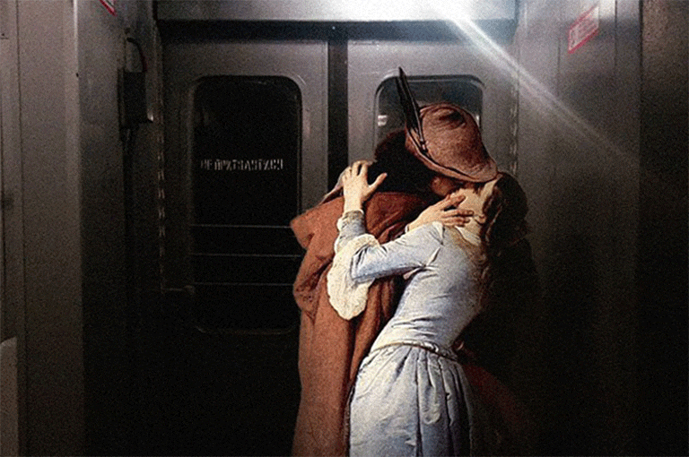 Il Bacio di Francesco Hayez è una delle opere ricollocate, attraverso un abile uso del fotoritocco, in un periodo moderno dal designer ucraino Alexey Kondakov.