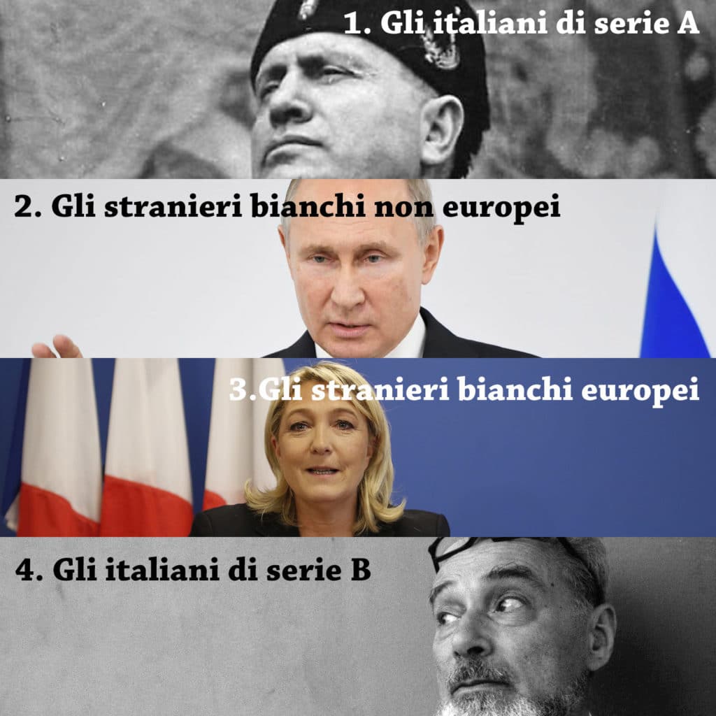 Siccome è un po’ complicato provo a fare chiarezza elencando le posizioni: prima gli italiani di serie a, poi gli stranieri bianchi non europei, poi gli stranieri bianchi europei, poi gli italiani di serie b, poi tutti gli altri.