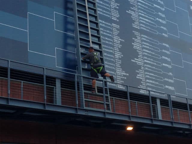 Dirigendoci verso la meta possiamo ammirare la scena fotografata qui sotto: l’aggiornamento manuale dei megatabelloni dei risultati. Affascinante a suo modo, non fosse che nel 2015 mi chiedo perché sia necessario inviare un uomo sulle scale ad effettuare l’operazione manualmente. È una tradizione secolare? Una punizione per i dipendenti che sbagliano? Una coreografia per questi americani che ne sono sempre affamati?