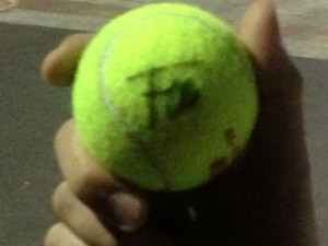 Dopo l’intervista ecco il rito delle palline firmate, all’ultima Flavia Pennetta si gira verso la nostra tribuna, ci sbracciamo (ci mancherebbe altro), ci guarda, sì siamo sicuri ci guarda, ci sorride, sì siamo sicuri anche di questo in mancanza di testimoni, e ci tira quella pallina, precisa precisa: gira la palla, gira la palla.